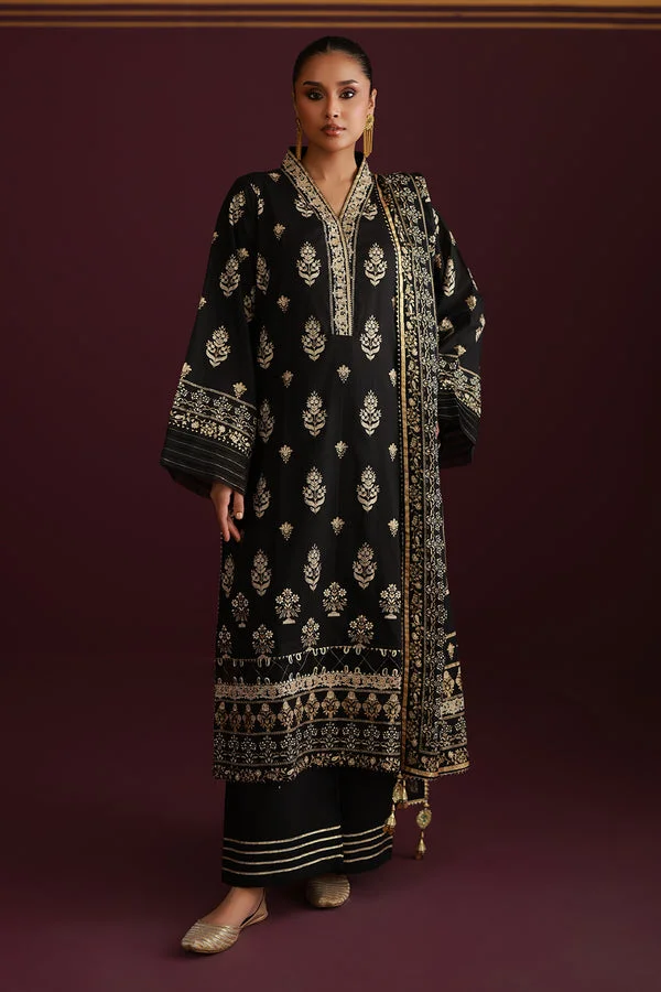 A stylish, colorful summer kameez with floral pattern designs along the front, back, sleeves, and dupatta, together with a green trouser piece. Buy cotton shirts online for only Rs 1890. Let’s talk about these beautiful cotton suits from the leading brand Zellbury. Scroll down this page and learn all the details about these images. Zellbury Summer Collection